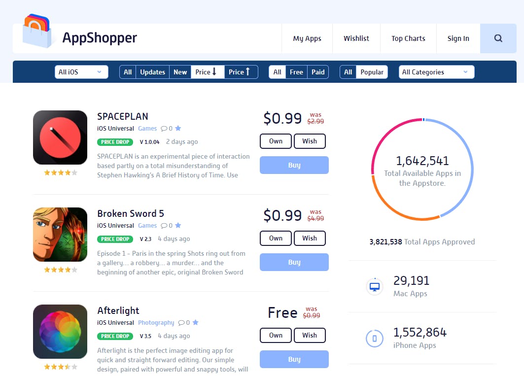 Zoek je een app, bijvoorbeeld om een foto op je iPad of iPhone te bewerken, maar wil je niet te veel betalen, kijk dan op AppShopper. Deze app biedt een overzicht van alle aanbiedingen in de App Store en laat een mooi overzicht zien van de prijshistorie. Zo zie je in één oogopslag of een app onlangs in prijs is verhoogd. Tevens kun je een wensenlijstje maken, waarna je een waarschuwing krijgt als een van de apps in prijs is gezakt of zelfs helemaal gratis is geworden. Op AppShopper.com kun je zoeken naar iOS-, iPhone-, iPad- en zelfs Mac-apps, maar ze bieden ook een handige app voor je iPhone.