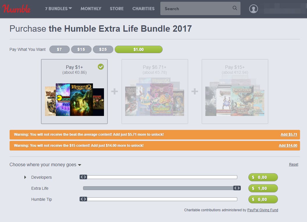 Het concept van Humble Bundle is fraai: koop spellen voor een prikkie en steun ook nog eens een goed doel. Bij Humble Bundle bundelen ze boeken of games voor een klein prijsje. Je kunt meestal kiezen uit drie verschillende prijscategorieën, vrijwel altijd startend met 1 dollar. Hoe meer je betaalt, hoe meer je krijgt. Ook kun je aangeven hoeveel geld je aan de ontwikkelaar, liefdadigheidsinstelling en Humble Bundle zelf geeft. In het verleden zijn er vele mooie aanbiedingen geweest, waarbij zelfs Nintendo- en PlayStation-games werden aangeboden vanaf 1 dollar. Betalen kan gemakkelijk via PayPal.