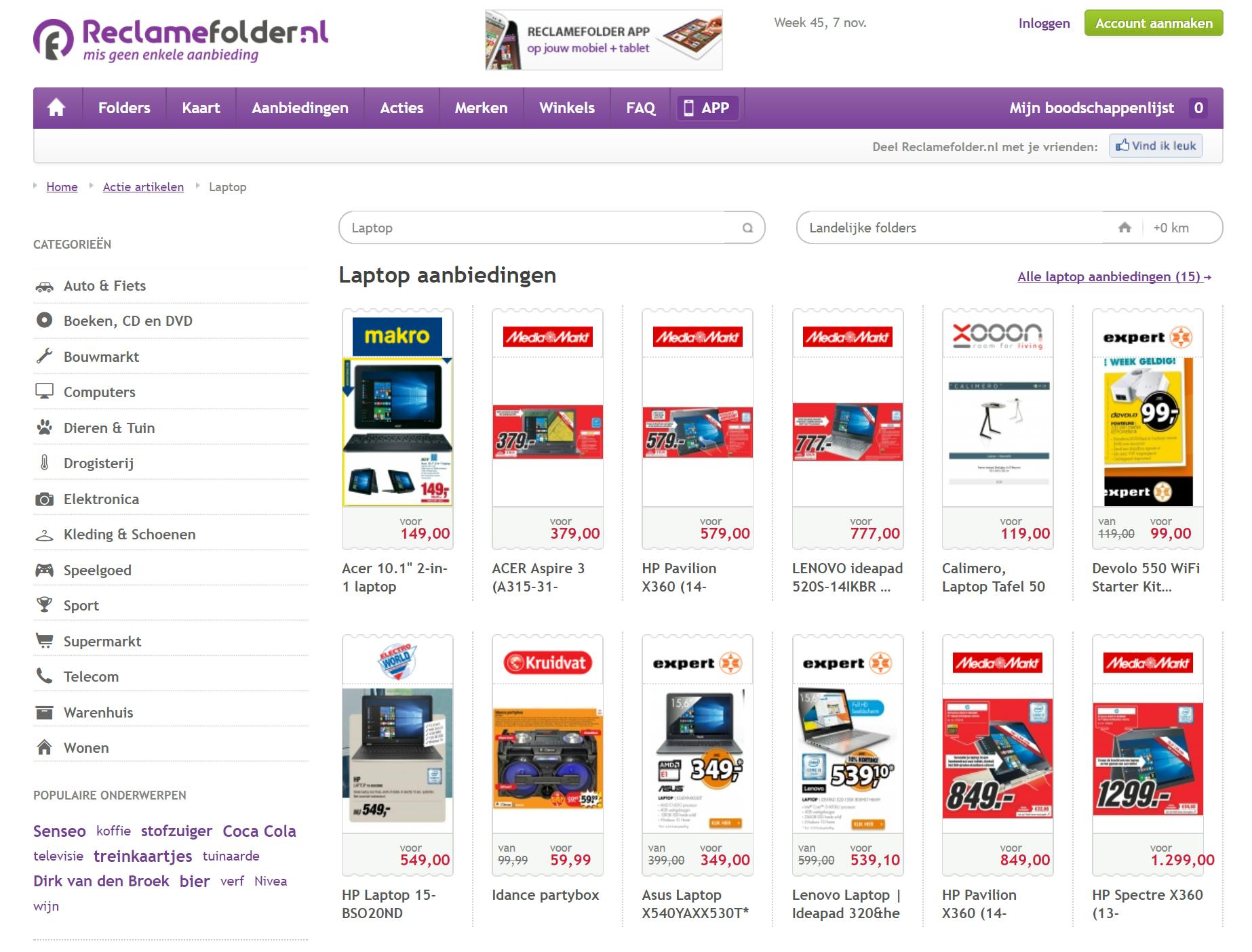 Niks leest lekkerder dan van een stuk papier, maar er is één ding dat papier niet heeft: een zoekfunctie. Ben je alleen op zoek naar een laptop, dan wil je niet eindeloos door alle folders bladeren. Op de website Reclamefolder.nl staan alle folders digitaal en daarbij is ook de zoekfunctie toegevoegd. Nu hoef je alleen nog maar de zoekterm van jouw gewilde apparaat in te voeren voor een supersnel resultaat.