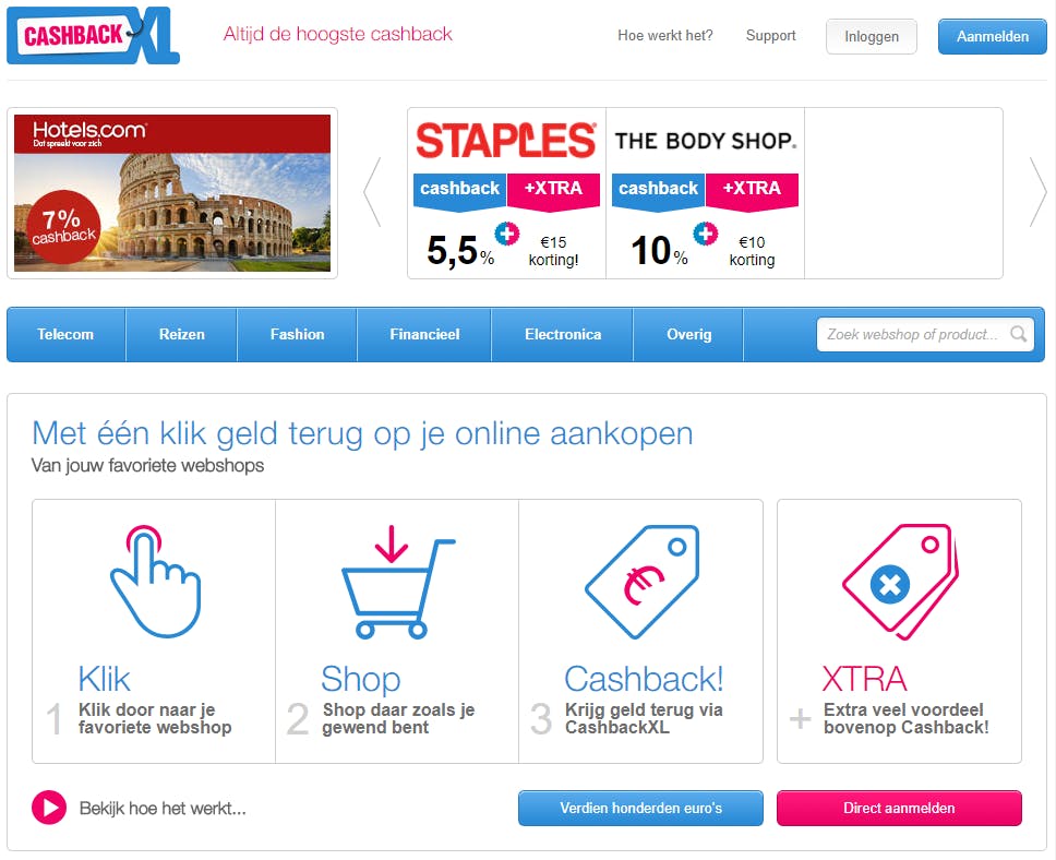 Krijg geld terug op je online aankopen! Koop je via Cashback XL een product bij een aangesloten winkel, dan krijg je een deel van het aankoopbedrag terug. Veel grote warenhuizen als MediaMarkt, Coolblue en Wehkamp doen mee. Koop je een laptop of nieuwe tv, dan bespaar je al snel enkele tientjes op je aankoop, en dat is toch lekker besparen.
