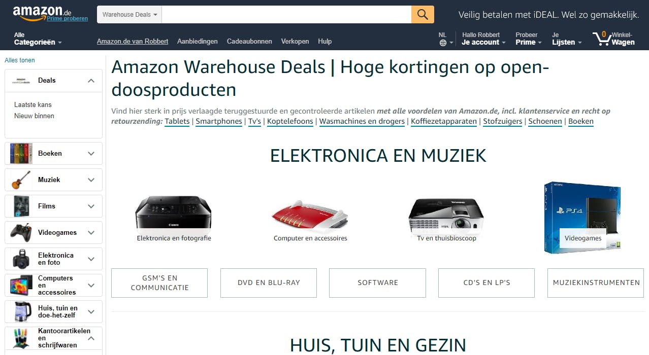 Hoewel Amazon geen website in Nederland heeft, levert Amazon wel vaak aan Nederland. Inmiddels is het zelfs mogelijk om op Amazon.de te betalen met iDEAL of via automatische incasso, zodat het gerommel met een creditcard verleden tijd is. Wat voor de koopjesjagers vooral interessant is aan Amazon, zijn de Warehouse Deals. Hier vind je doorgaans producten die zijn geretourneerd (de zogenoemde open-doosproducten). De spullen worden dikwijls voor zeer aantrekkelijke prijzen verkocht. Daarmee lever je vaak wel in op de garantie, want die is bij veel Warehouse Deals beperkt – soms zelfs tot maar drie maanden.