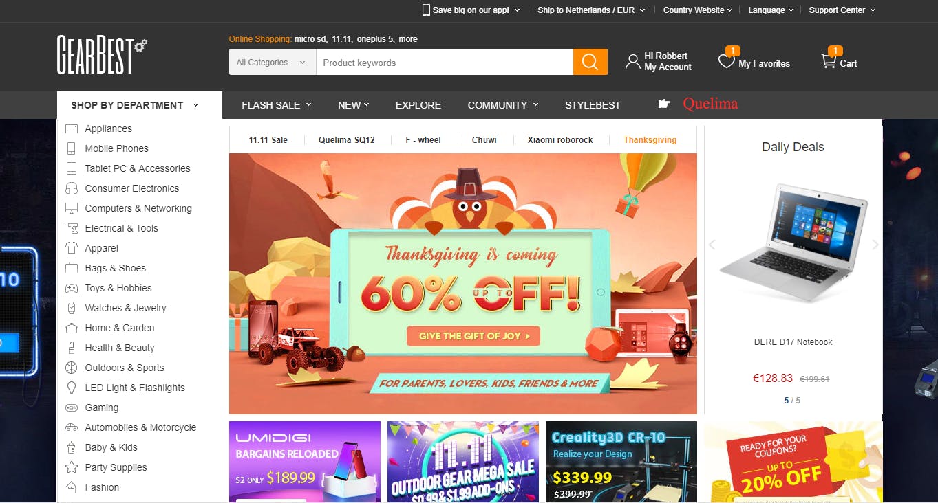 Goedkope gadgets en kabels schaffen we graag via de Chinese webshops aan. Vaak zijn de producten immers aanzienlijk goedkoper dan bij de gebruikelijke elektronicazaak. AliExpress is een mooi voorbeeld, maar zij bieden met name een breed assortiment. Wie vooral geïnteresseerd is in elektronische gadgets kan voor voordelige koopjes ook terecht bij GearBest. GearBest richt zich voornamelijk op gadgets als drones, slimme verlichting, smartphones, 3D-printers en dergelijke. Betalen gaat gemakkelijk via PayPal, maar google voordat je tot aankoop overgaat nog even naar een kortingscode; deze zijn voor GearBest vrijwel altijd te vinden en kunnen oplopen tot wel een halvering van de prijs.