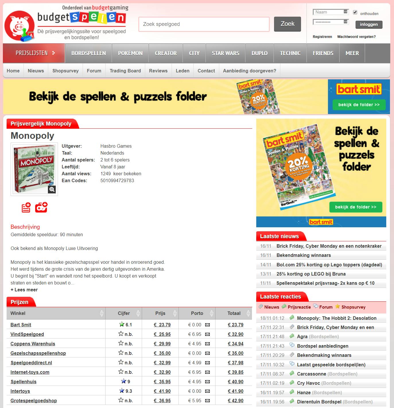 Budgetspelen is de zusterwebsite van Budgetgaming.nl. Deze website richt zich niet op videospelletjes, maar op speelgoed zoals LEGO, Pokémon en bordspellen. De community is niet zo groot als die van Budgetgaming.nl, waardoor er ook minder snel een aanbieding of prijsfout wordt gedeeld. Maar via de prijsvergelijker zie je wel in één oogopslag waar Monopoly 40 euro kost en waar je dat spel voor 23 euro kunt scoren. Je kunt er dus wel flink besparen.
