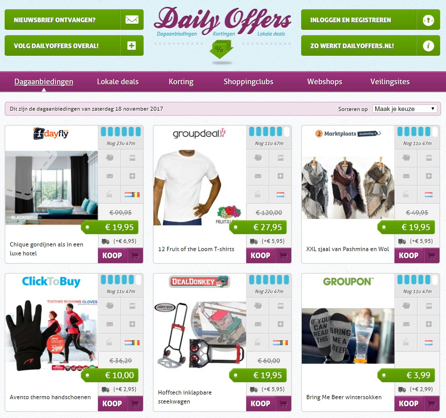 Hoewel iBOOD de pionier was van de dagelijkse koopjes, zijn er in de jaren erna tientallen andere websites bijgekomen die óók dagelijks een andere aanbieding voor je in petto hebben. De website Daily Offers heeft alle websites verzameld en laat dagelijks het volledige aanbod van ééndagsaanbiedingen zien. Dat scheelt weer het doorzoeken van alle websites en subpagina’s van subaanbiedingen. Nog handiger is dat alle aanbiedingen via Daily Offers kunnen worden gesorteerd op de hoogste korting en de laagste prijs.