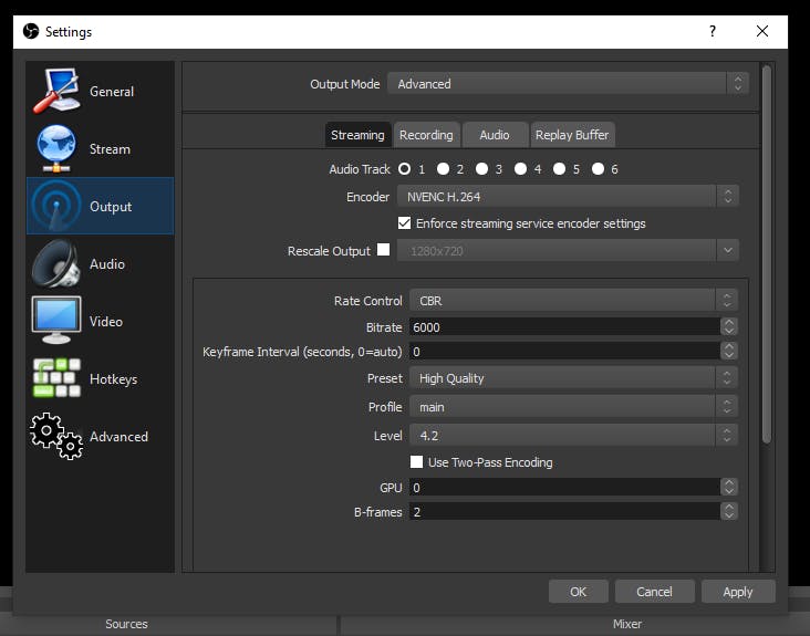 Ga vervolgens naar de Output-tab en zet de Output Mode op Advanced. Pc-gamers met een zeer krachtige cpu kunnen de Encoder-instelling op x264 zetten voor de beste beeldkwaliteit. Als je niet zeker weet of je pc krachtig genoeg is, zet je de Encoder-instelling op NVENC (Nvidia) of het AMD-alternatief. Zet de Bitrate-instelling op CBR en 6000 (voor 1080p60) of 4000 (voor 1080p30). Zet de Keyframe Interval op 2.