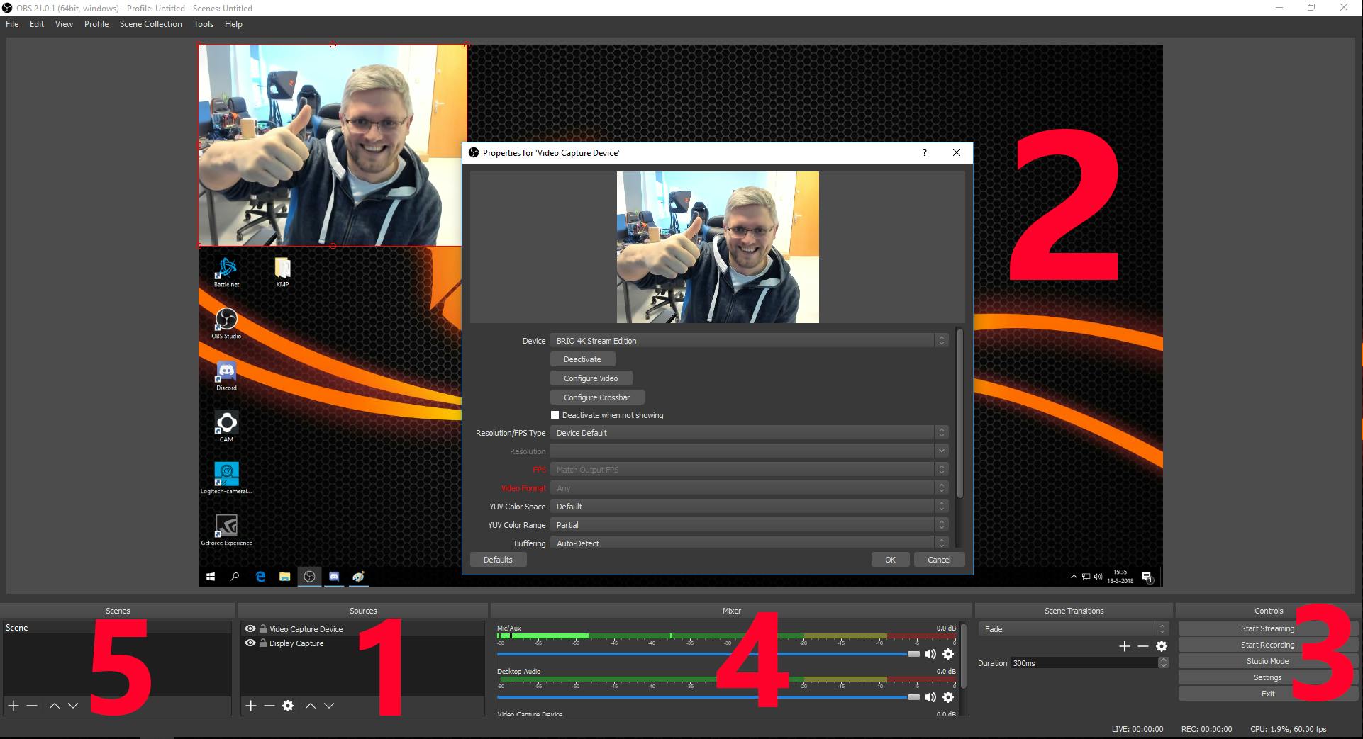 Je webcam voeg je ook als Source toe bij Video Capture Device. Je webcam verschijnt dan boven op je schermweergave in het hoofdvenster van OBS (2). In dat venster kun je onderdelen op reguliere wijze met de muis vergroten, verkleinen of verplaatsen. Tip: door alt ingedrukt te houden kun je je webcamopname ook croppen; zo snijd je ongewenste stukjes weg. Geef nu je webcamstream een mooi plekje in beeld.