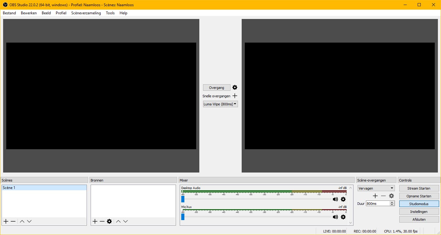 Wanneer je OBS hebt gedownload en gestart, krijg je een interface te zien vol met opties en knoppen. Schrik daar niet van, het lijkt heel veel, maar de interface is echt heel eenvoudig en een deel van de opties zul je nooit gebruiken. Je ziet twee grote zwarte vlakken in beeld. Dit zijn de monitors waarop je kunt zien wat je gaat uitzenden. Het vlak aan de linkerkant is de omgeving waarin je alles voorbereidt. Wat je hier ook toont, het zal niet te zien zijn in je live video. De inhoud die (straks) wordt weergegeven in het zwarte vlak aan de rechterkant, is de inhoud die daadwerkelijk wordt getoond in je live video. Met de knop Overgang in het midden van deze twee vlakken, zorgt ervoor dat je de inhoud van het linkervenster, naar het rechtervenster stuurt, oftewel, zodra je hierop drukt zeg je: ik wil uitzenden wat ik hier in het linkervenster heb gemaakt. Vervolgens zie je onderin nog een aantal deelvensters met koppen, die we in de tips hierna gaan behandelen.