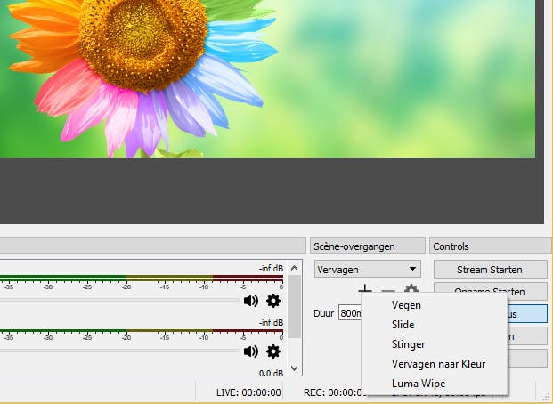 De video die je zojuist hebt toegevoegd, heeft mogelijk niet het juiste formaat. Dat is geen probleem, je kunt deze eenvoudig verplaatsen en schalen naar het juiste formaat. De inhoud van dit beeld zul je, zoals omschreven, alleen in het linkervenster zien. Pas als je klikt op Overgang zal deze naar je livefeed worden gezet. Klik er maar eens op, dit kan nu nog geen kwaad, want we hebben nog geen streamsleutel ingevuld. Je ziet je bron ook aan de rechterkant verschijnen, met een overgangseffect. Standaard is dit het effect Vervagen. Onder het kopje Scène-overgangen rechts onderin kun je aangeven welke overgangen je wilt gebruiken (met het plusteken voeg je nieuwe toe) en hoelang deze overgangen duren. Zo heb je dus volledige controle over hoe het ene beeld overgaat in het andere en dat maakt je video direct een stuk professioneler.
