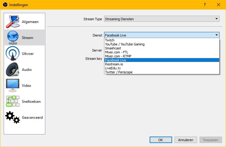 Nu je de basis weet met betrekking tot de interface, scènes, overgangen en bronnen, gaan we OBS vertellen op wat voor platform we precies willen streamen en hoe. Dit doen we via de knop Instellingen rechtsonder. Wanneer je hierop klikt, kom je in een zeer uitgebreid menu terecht en wederom willen we benadrukken: schrik hier niet van. Negeer de opties die we hier niet bespreken, je zult ze waarschijnlijk niet gebruiken. Klik op het tabblad Stream aan de linkerkant en selecteer Facebook Live in het uitklapmenu. Je ziet hier ook alle andere opties. Het voordeel van dit voorkeuzemenu, is dat de instellingen voor de geselecteerde dienst direct goed zijn ingesteld, je hoeft verder zelf geen waarden in te vullen bij server, enzovoort. In dit menu zie je ook een optie, genaamd Stream key. Deze sleutel heeft OBS nodig om te communiceren met je Facebookpagina, zodat er een connectie kan worden gemaakt tussen je live video en OBS. Die sleutel vraag je aan via Facebook zelf en dit bespreken we in de volgende tip.