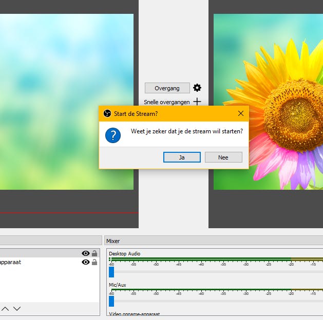Je bent klaar om te starten. Je kunt op dit moment nog rommelen wat je wilt, er zal op Facebook niets te zien zijn, zélfs niet als de video is gestart. Het is tijd om je video voor te bereiden. Maak scènes aan met alle onderdelen die je in je video wilt tonen. Denk dus aan afbeeldingen die je voorbij wilt laten komen, video’s die je wilt tonen, eventueel een intro … je kunt het zo gek maken als je zelf wilt. Oefen met het ‘regisseren’ van je video. Kijk hoe het programma reageert wanneer je op scènes klikt, bronnen versleept enzovoort. Zet het geluid op je pc aan, om te controleren welke geluiden hoorbaar zijn (dit kun je zien in de mixer). Sleep het volume van Desktop audio in het veld Mixer omlaag als je niet wilt dat systeemgeluiden (zoals ontvangen mails) ook hoorbaar zijn. Heb je geoefend en ben je klaar om te streamen? Klik dan op Stream starten. Zodra je dit hebt gedaan, zal de inhoud van het rechterdeelvenster zichtbaar zijn op Facebook (maar uiteraard alleen als het geplande bericht op Facebook ook echt live is). Je bent nu live aan het streamen via OBS!