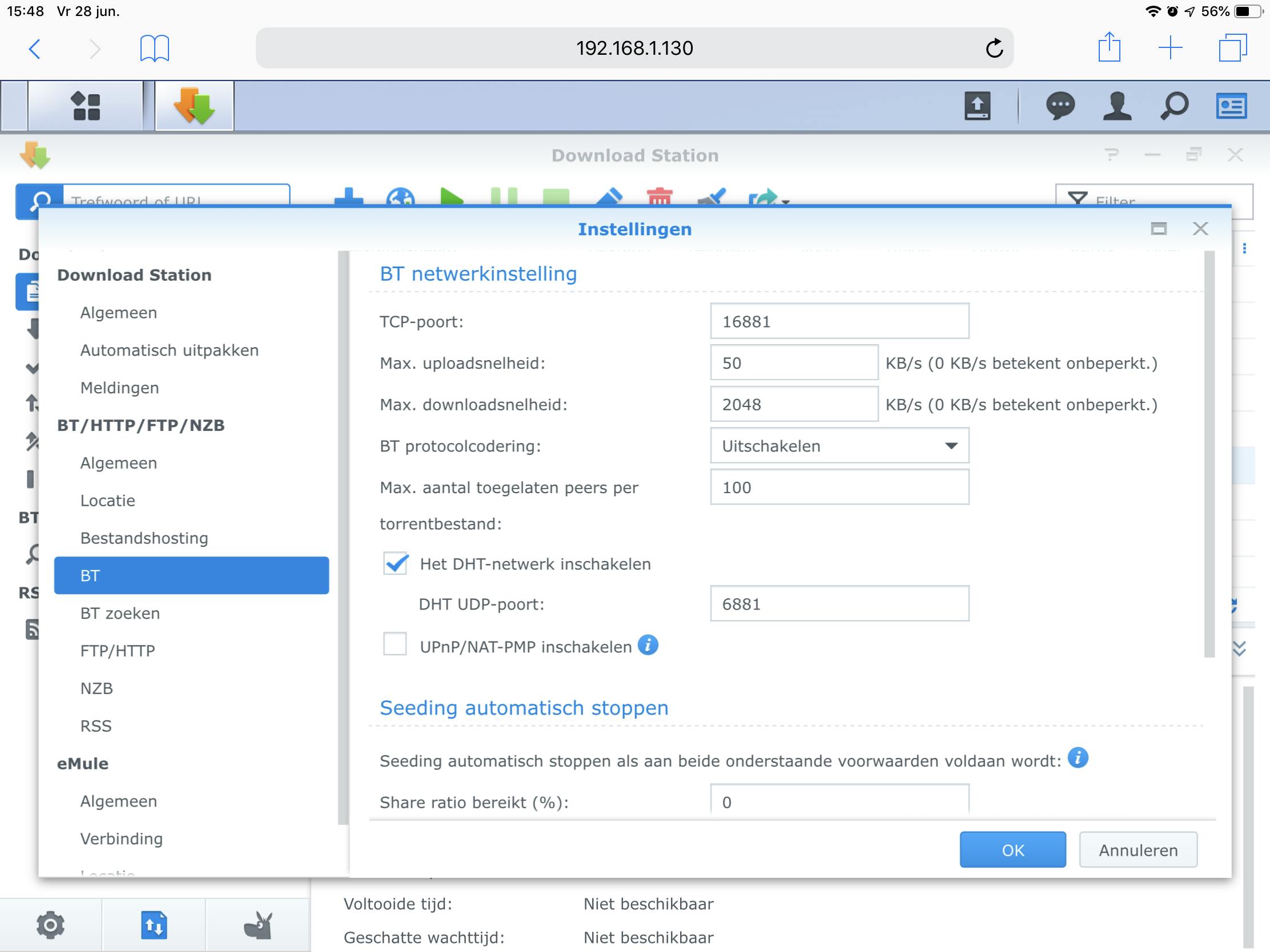 Vul achter Max. downloadsnelheid een waarde in die wat onder de maximale downloadsnelheid van je internetverbinding ligt. Daarmee houd je ook tijdens het downloaden voldoende ademruimte over om dingen als browsen, mailen, whatsappen en meer via het thuisnetwerk te kunnen blijven doen. Om het verplichte uploaden direct na het voltooien van de download te stoppen, vul je achter Share ratio bereikt (%) de waarde 0 in. Kies achter Seeding tijdsduur bereikt de optie Negeren.
