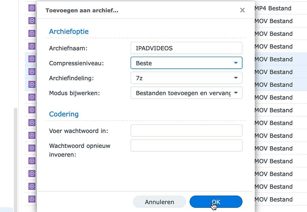 Klik nogmaals met de rechter muisknop op een geselecteerd bestand (of bestanden) en check wat je zoal nog meer kunt doen. Aardig is dat File Station over een redelijk uitgebreid compressietooltje beschikt. Klik in het contextmenu op Toevoegen aan archief en je kunt alles naar wens instellen.
