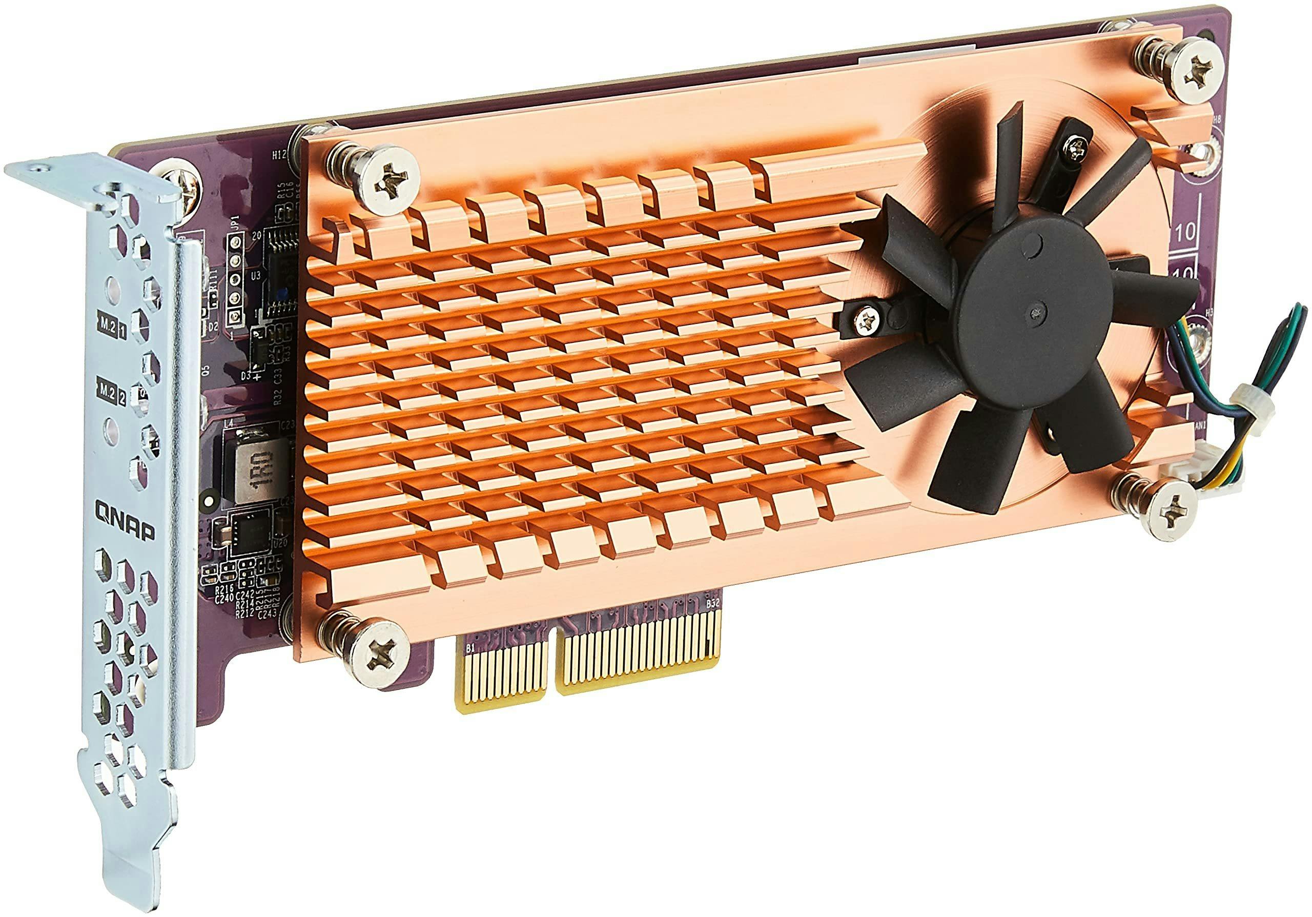 Integreer met deze PCI Express-uitbreidingskaart twee NVMe-ssd’s in een geschikte NAS van QNAP. Ideaal voor ssd-caching, zonder dat je hierbij een 3,5inch-schijfslot bezet houdt. Veel netwerkapparaten van het Taiwanese merk hebben namelijk een vrij PCIe-slot, zodat je met behulp van dit onderdeel eenvoudig twee m.2-ssd’s met een 2280- of 22110-formaat kunt toevoegen.
