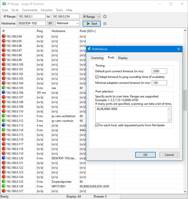 Is het je alleen te doen om heel snel de ip-adressen en hostnamen van de aangesloten toestellen te vinden, probeer dan vooral eens naar het multi-platform en portable Angry IP Scanner. Je hoeft hier alleen het gewenste ip-bereik in te vullen (bijvoorbeeld 192.168.0.1 to 192.168.0.254) en op Scan te drukken. Standaard werkt de tool met ping-verzoeken, maar via Tools / Preferences kun je op het tabblad Ports ook op specifieke poorten laten scannen, bijvoorbeeld met 80,88,8080-9000. Denk eraan netwerkapparaten die door meerdere gebruikers worden benaderd, zoals een NAS of netwerkprinter, een vast ip-adres mee te geven of minstens in de DHCP-reservering (‘static lease’) van je router op te nemen. In zo’n tabel kun je namelijk het MAC-adres of de hostnaam aan een ip-adres koppelen, zodat de DHCP-service telkens hetzelfde ip-adres aan dat toestel zal toekennen.