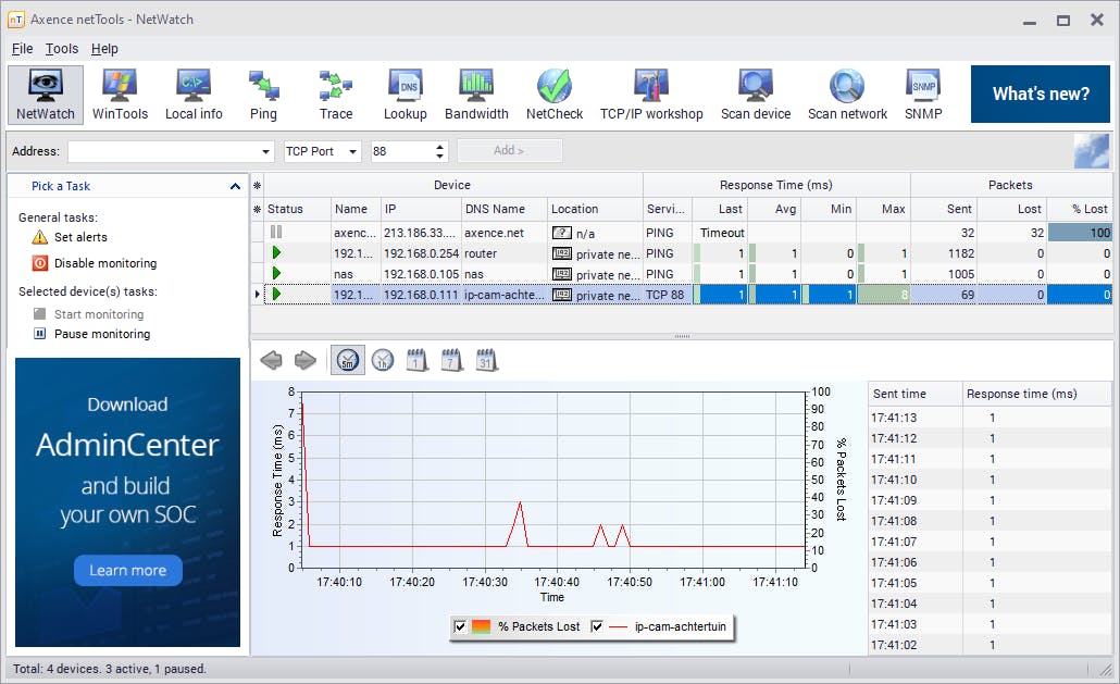 Je voegt de gewenste scan vervolgens toe aan de monitorlijst met Add. Vanuit het contextmenu van zo’n item in de lijst kun je het monitoren altijd pauzeren of verwijderen. Je kunt hier tevens een reset uitvoeren waarna alle reeds vergaarde statistische informatie wordt verwijderd. Merk op dat je in het linkerdeelvenster, bij Device options, onder meer ook de scanfrequentie, oftewel Monitoring time, kunt aanpassen. Standaard staat die op één seconde. Ook de optie Timeout is aanpasbaar. Die is standaard ingesteld op 1000 ms.