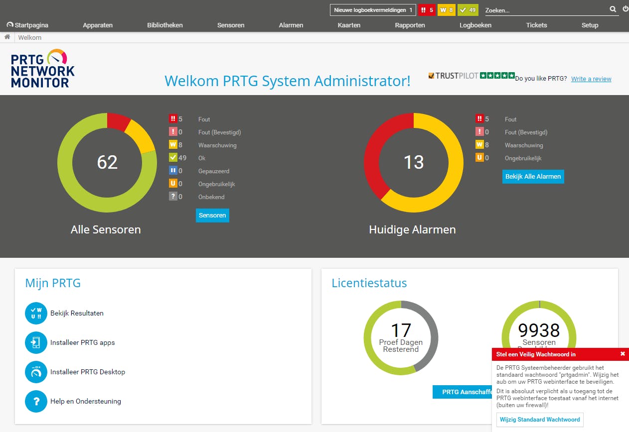 De kans is groot dat je meteen twee meldingen krijgt: één om een beveiligde verbinding te gebruiken (via https) en één om het standaard wachtwoord te wijzigen (hetzelfde als de beheerdersnaam: prtgadmin). Beide meldingen handel je af met een paar muisklikken, tenzij je absoluut een eigen ssl-certificaat wilt gebruiken voor de https-verbinding, maar dit laten we hier buiten beschouwing.