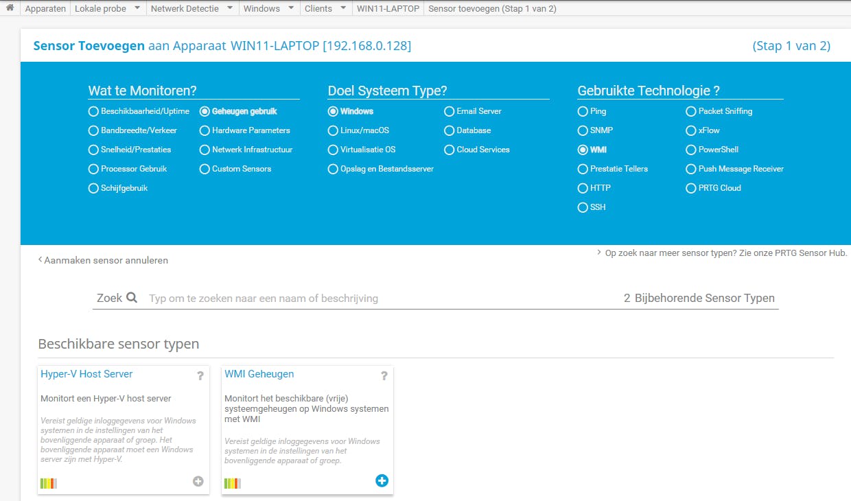 Een sensor maken doe je door met rechts op een apparaat te klikken en Sensor toevoegen te kiezen. Je krijgt dan een hele reeks geschikte sensoren te zien, maar het werkt wellicht efficiënter als je in het blauwe vak bovenaan eerst de gesuggereerde opties selecteert, zoals Geheugen Gebruik, Windows, WMI, zodat automatisch geschikte sensoren verschijnen. In dit voorbeeld is dat onder meer WMI Geheugen, waarmee je het vrije systeemgeheugen op Windows-systemen kunt monitoren. Klik op de gewenste sensor, vul de nodige informatie in en bevestig met Aanmaken.