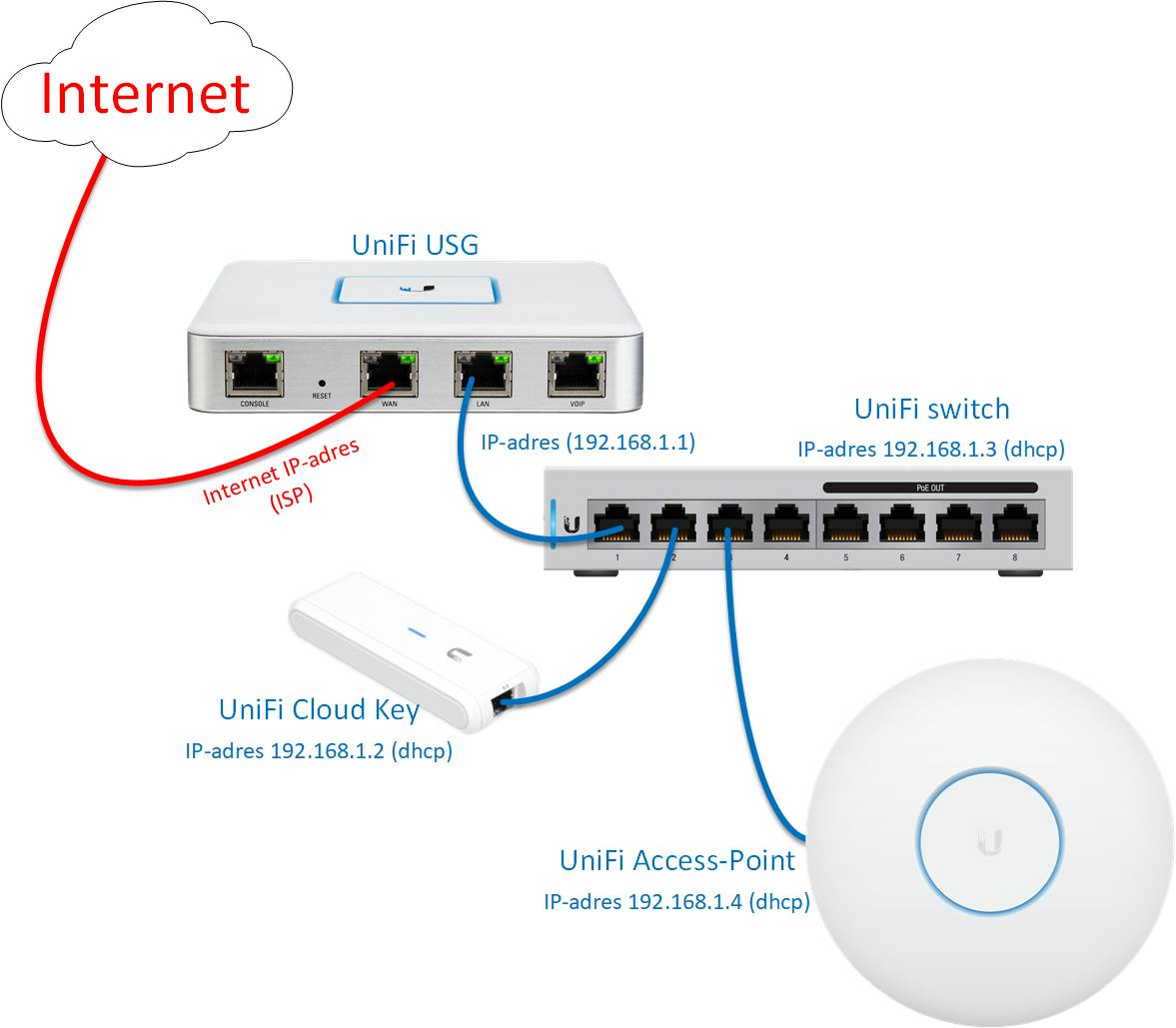 Om over te schakelen op het nieuwe netwerk, schakel je eerst alle oude netwerkspullen uit. Sluit dan de wan-poort van de nieuwe USG-router aan op de modem van de internetprovider en verbind de lan-poort van de USG-router met een van de poorten op de UniFi-switch. Verbindt de Cloud Key met een van de PoE-poorten van de switch, of sluit behalve de netwerkkabel ook de elektriciteitsvoeding van de Cloud Key aan. Gebruik je de software op een Raspberry Pi, verbind dan die met de switch. Sluit tot slot het UniFi-accesspoint aan op bij voorkeur een PoE-poort of gebruik de PoE-injector om deze van de benodigde elektriciteit te voorzien. Schakel daarna alle apparaten in.