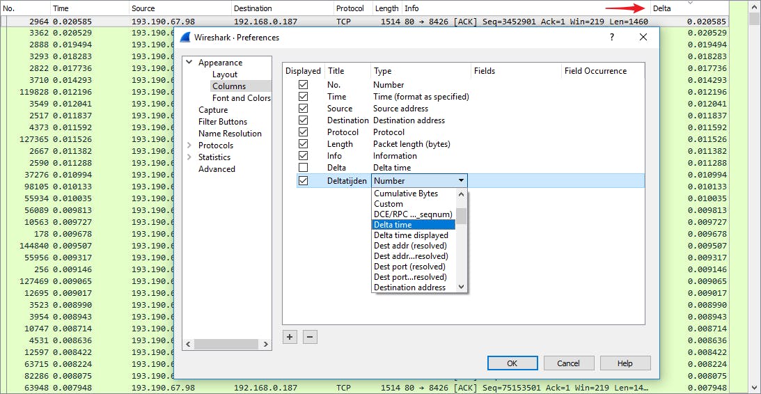 Een niet onbelangrijk aspect van de netwerkprestatie is tevens de ‘latency’: de vertraging tussen de aanvraag en de ontvangst van de eerste pakketten. Ook in dit geval kan Wireshark van pas komen. Maak een extra kolom die de ‘deltatijden’ weergeeft: ga naar Edit, kies Preferences, open de rubriek Appearance en klik op Columns.