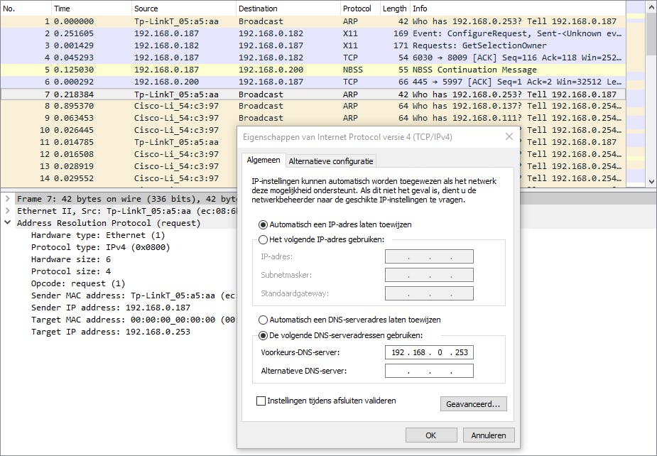 Wanneer je zo’n arp-request aanklikt, krijg je automatisch extra informatie te zien in het venster met pakketdetails. Hieruit bleek dat de Wireshark-machine vruchteloos op zoek was naar adres 192.168.0.253. Opvallend waren ook de arp-requests van de router die zijn eigen ip- en mac-adres kenbaar maakte (192.168.0.254).