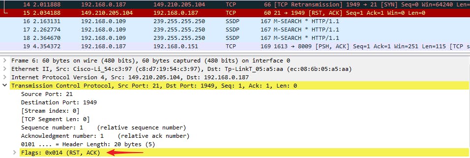 Probeer als experiment maar een ftp-sessie op te zetten, bijvoorbeeld met behulp van FileZilla, met een server die poort 21 gesloten houdt. Je zult merken dat meteen na het uitsturen van het SYN-pakket door de client een RST, ACK-pakket van de server volgt: een reset dus die de verbinding abrupt verbreekt. Overigens vind je deze informatie ook terug via Analyze / Export Information, bij Warning, Connection reset (RST). Dat maakt je al duidelijk dat de service niet bereikbaar is, wellicht wegens een foutief adres of een gesloten poort.