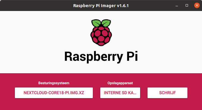 Klik in Raspberry Pi Imager op Selecteer OS en kies dan onderaan Gebruik eigen bestand. Selecteer het image dat je zojuist hebt gedownload, nextcloud-core18-pi.img.xz. Steek dan je microSD-kaartje in de pc en klik op Kies opslagapparaat om je microSD-kaart te selecteren. Klik tot slot op Schrijf om het image te schrijven.