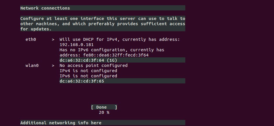 Bevestig met OK dat je aan de netwerkconfiguratie wilt beginnen. Als je een ethernetkabel hebt aangesloten, zal de Pi automatisch via DHCP een ip-adres krijgen en hoef je dit alleen maar te bevestigen door met de pijltjestoetsen naar Done te gaan en op Enter te drukken.