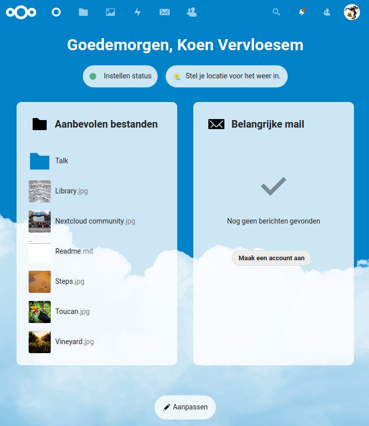 In dit venster vind je ook links naar documentatie voor enkele belangrijke taken, zoals je agenda configureren, je contacten instellen en toegang tot de bestanden verkrijgen via WebDAV, zonder de Nextcloud-client. Klik uiteindelijk op Starten met Nextcloud. Daarna krijg je je dashboard te zien, met aanbevolen bestanden en eventuele meldingen. Dit kun je naar wens aanpassen.