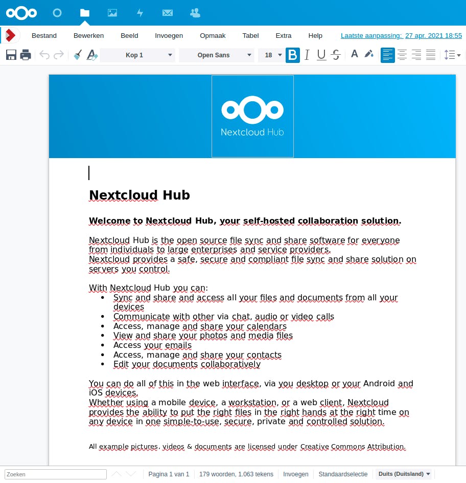 Als alles goed gaat, kun je daarna op een officedocument in je bestanden van Nextcloud klikken en opent Collabora Online het document automatisch. Dit bestand bewerk je in je browser, desgewenst samen met anderen als een andere gebruiker op je Nextcloud-installatie hetzelfde document opent.