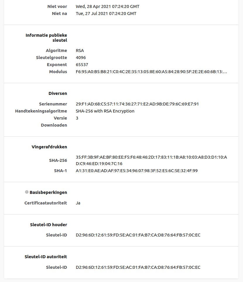 Je browser geeft je wel de waarschuwing dat het certificaat niet vertrouwd is. Bekijk dus de vingerafdruk van het certificaat. In Firefox klik je daarvoor bij de waarschuwing op Geavanceerd en dan op Certificaat bekijken. Zoek dan bij Vingerafdrukken naar SHA-256. Je ziet daar een lange tekenreeks staan.