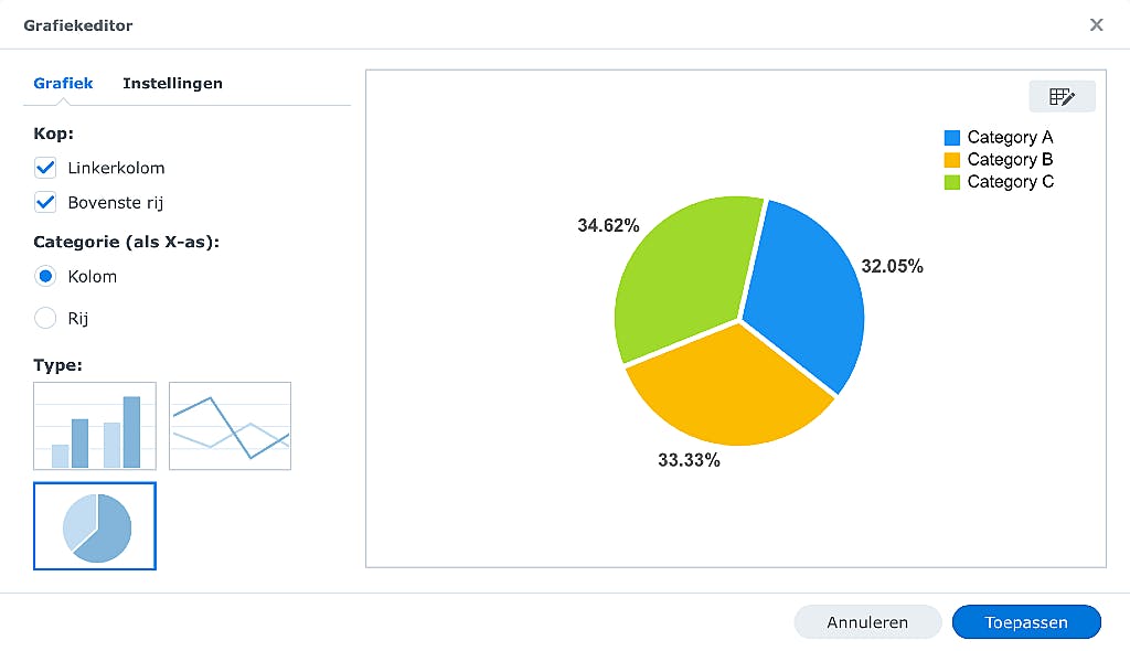 Kies uit een van de drie beschikbare grafiektypen en dan – als je tevreden bent en wellicht nog wat aanpassingen aan labels en kleur hebt gemaakt – op Toepassen. Je grafiek wordt nu ingevoegd in de notitie.
