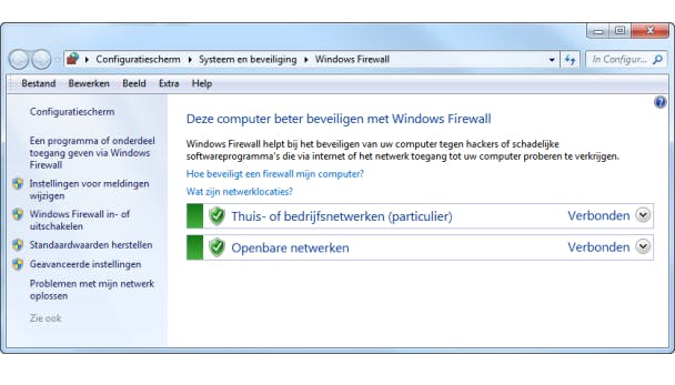 Dit hoeft geen dure beveiligingssoftware te zijn met jaarlijkse abonnementen: een gratis scanner voldoet prima. Ook heb je firewall-software nodig om eenvoudige inbraakpogingen aan je adres tegen te houden. Windows heeft een firewall aan boord die deze taak voor zijn rekening neemt. Je vindt de instellingen hiervan in Windows 7 via Configuratiescherm / Systeem en beveiliging / Windows Firewall.