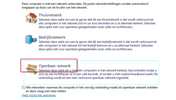 Door bestanden, mappen en media te delen via een (al dan niet bewuste) verkeerde instelling maak je het voor andere (netwerk)gebruikers erg gemakkelijk om gegevens te ontfutselen. Kies bij een nieuwe (draadloze) verbinding altijd voor Openbaar netwerk. Gebruik de instelling Thuisnetwerk of Bedrijfsnetwerk alleen thuis of op je werk. Met de instelling Openbaar netwerk voorkom je dat Windows bestanden, mappen en andere gegevens bereikbaar maakt via het netwerk en/of internet.