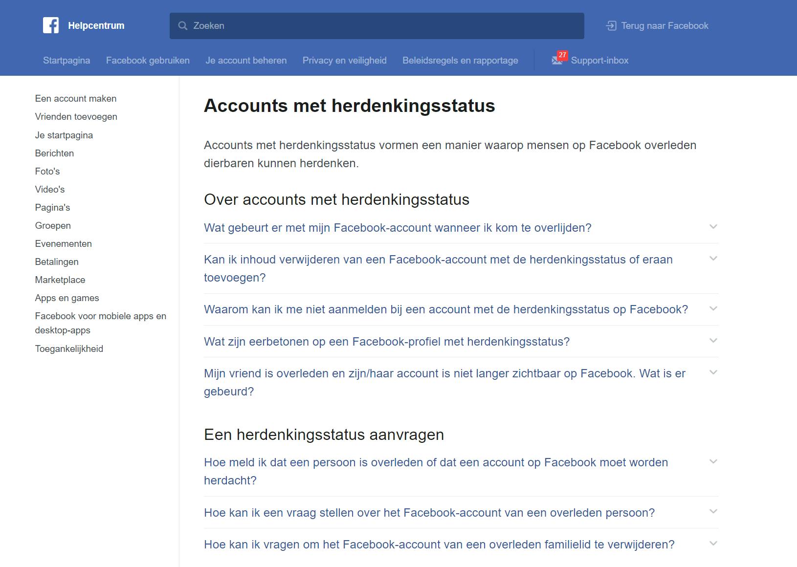 Dat realiseert Facebook zich ook en daarom biedt de dienst al jaren aan om profielen om te zetten in gedenkpagina’s. Wanneer een pagina een herdenkingsstatus krijgt, komt er Ter nagedachtenis van naast de naam te staan, zodat iedereen kan zien dat dit geen gewone profielpagina is. Afhankelijk van de privacy-instellingen kunnen familie en vrienden berichten achterlaten, en we zien dat dit op belangrijke dagen, zoals feestdagen, sterfdag of verjaardag veel gebeurt.