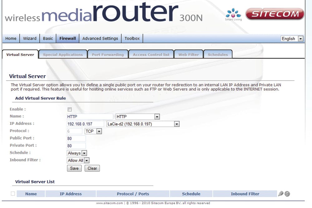 Als uw browser bijvoorbeeld de website www.computeridee.nl opvraagt, klopt hij aan bij het ip-adres van www.computeridee.nl op deze poort. Wordt daar niet opengedaan, dan geeft het programma aan dat die website niet te vinden is. Wilt u nu via een browser van buitenaf toegang krijgen tot uw nas, dan moet u in uw router aangeven dat al het verkeer dat van buitenaf aanklopt op poort 80 van uw (internet-) ip-adres, wordt doorgestuurd naar de nas. Bovenstaande schetst het principe; de manier waarop dat in de router werkt, kan per model verschillen. Op de website portforward.com is een zeer uitgebreid overzicht te vinden van handleidingen voor vele verschillende routers. Sommige nasapparaten kunnen het zelf regelen, met behulp van automatische poorttoewijzing; doorgaans activeert u dat door een vinkje te plaatsen ergens in het netwerkmenu van de netwerkschijf. Met de hand kan het ook. Meestal is dit onderdeel te vinden onder het kopje firewall in het menu van de router. Voor dit artikel gebruiken we een Sitecom WL-350 router, waar onder het kopje Virtual Server de doorstuurmogelijkheden te vinden zijn. Selecteer ‘http' bij ‘Name', de router selecteert automatisch de publieke poort 80 (die aan de kant van internet) en private poort 80, de poort waarop het verkeer wordt doorgesluisd naar het apparaat binnen het netwerk (zie afbeelding). Onder het kopje IP Address moet u het ip-adres opgeven van de netwerkschijf. Deze router van Sitecom laat u ook op de (computer)naam selecteren. Dat is herkenbaarder dan het ip-adres. Prettig, maar sommige routers zijn niet zo slim.