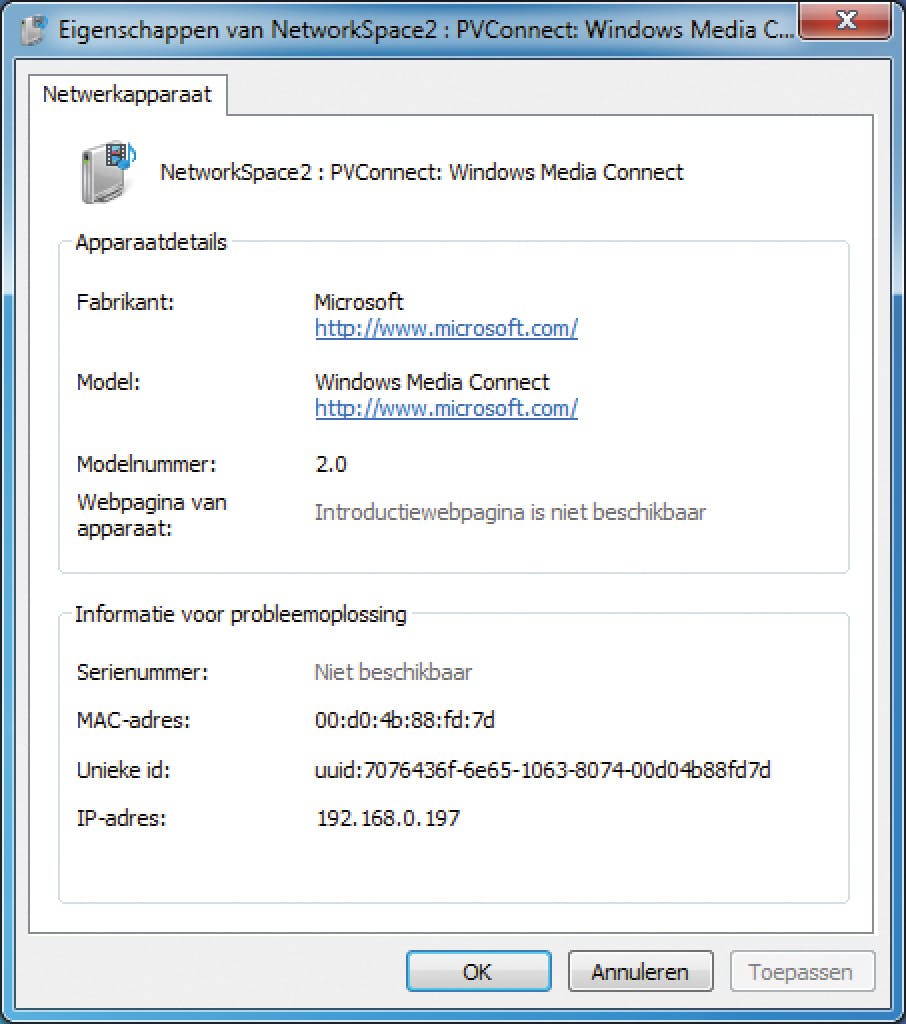 Een andere mogelijkheid is het opvragen van de eigenschappen van de nas in het netwerkoverzicht van Windows (zie afbeelding) of het bekijken van de netwerkeigenschappen in de nas. Hebt u het ip-adres van de nas gevonden, (dat begint meestal met 192.168.xx) voer dat dan in en vergeet niet deze regel te activeren (enable) en op te slaan. Pas dan is deze regel actief. Door vanaf internet uw ip-adres dat u hebt gekregen van uw provider in te tikken, krijgt u toegang tot het webmenu van uw nas. Via dat menu kunt u bestanden bekijken, ophalen of bestanden toevoegen. Mocht u het ip-adres dat u hebt gekregen van uw provider niet (meer) weten, dan vindt u dat door in een browservenster whatismyip.nl in te tikken.