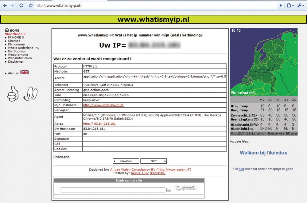 U krijgt dan uw ip-adres te zien (afbeelding). Wilt u geen toegang tot het webmenu geven, maar wilt u slechts bestanden overzetten, dan kunt u beter kiezen voor het ftp-protocol. Dit protocol maakt gebruik van poort 21. Voer dezelfde handelingen als hierboven uit, maar zet nu 21 neer waar eerst 80 stond. Vergeet wederom niet deze regel te activeren en op te slaan. Vanaf internet kunt u dan toegang krijgen tot de bestanden die toegankelijk zijn via ftp door in uw browser ftp://uwipadres in te tikken of door een ftp-client te gebruiken zoals Filezilla. Op een nas kunt u meestal per map bepalen of deze wel of niet via ftp toegankelijk is.