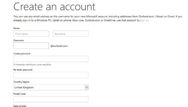 Heb je nog geen account bij Outlook.com, dan dien je er gratis eentje aan te maken. Surf in dat geval naar www.outlook.com en klik op Sign up now. Je dient nu wat persoonlijke gegevens op te geven en onderin te klikken op Create account om je account te maken.