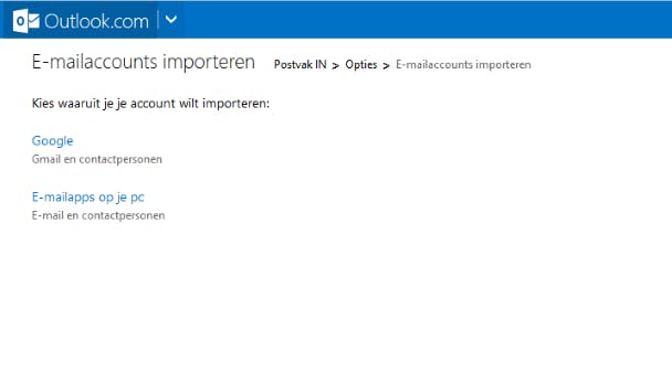 Nu je een Outlook.com-account hebt, kun je eenvoudig de gegevens uit Gmail importeren. Log in op Outlook.com. Klik op het pictogram met het tandwiel rechtsboven en vervolgens op Meer emailinstellingen. Op de pagina die verschijnt, klik je onder het kopje Accounts beheren op E-mailaccounts importeren en op de pagina daarna op Google. Klik op Opties, en kies of je de mails wilt importeren in je bestaande mappen of daar nieuwe mappen voor wilt aanmaken (wil je voorlopig de zaken nog even gescheiden houden, kies dan voor het laatste).