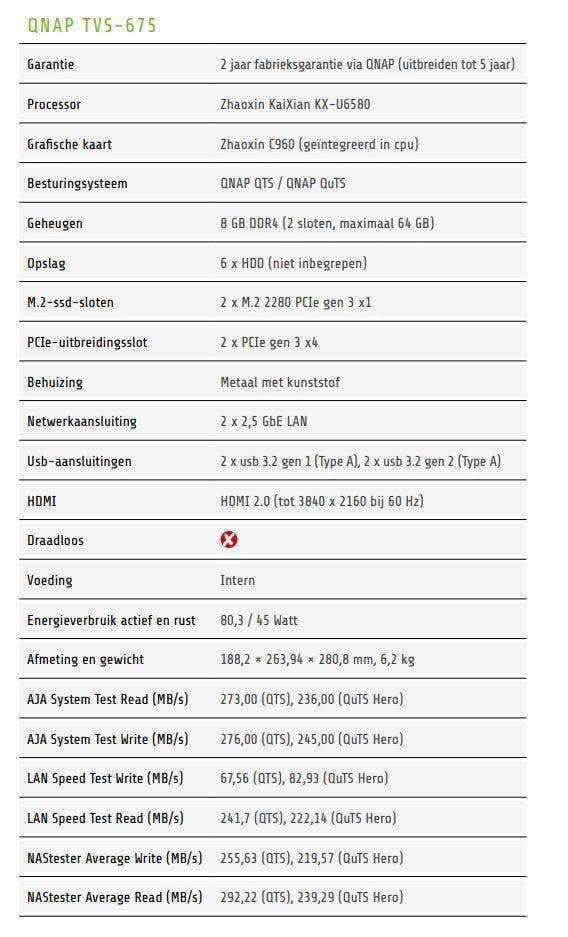 QNAP neemt met de toepassing van de Zhaoxin KaiXian KX-U6580 een gok. Gaan de klanten hierin mee of zijn er te veel bezwaren? Zeker omdat de prestatie her en der nog te wensen overlaat, ligt het massaal omarmen van deze NAS niet voor de hand. Vooral bij virtualisatie en mediagebruik moet het echt nog wel een slag beter. Wel voldoet de TVS-675 ruimschoots aan elk gebruiksscenario waarbij de nadruk ligt op opslag en back-uppen.