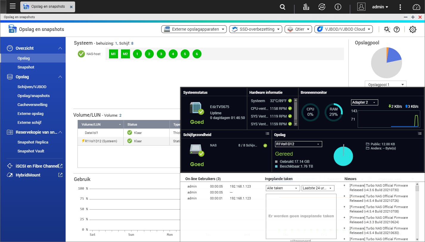 De TVS-675 biedt hiertoe zes vrije SATA-sloten waar evenveel harde schijven in geplaatst kunnen worden. De opslagcapaciteit kan via Opslag en snapshots, QNAP’s eigen opslagmanager, op tal van manieren worden ingericht. Natuurlijk als één groot volume, maar ook met meerdere opslagpools waarin een aantal van de schijven samenwerken en ruimte bieden aan één of meer volumes.