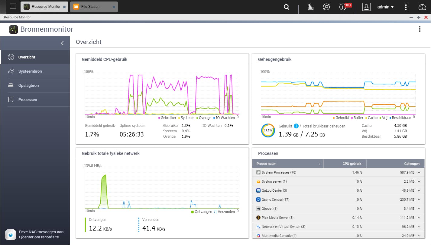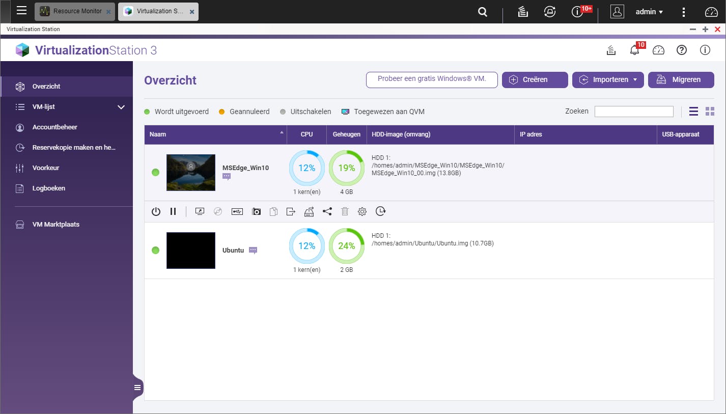 Teleurstellend is de toepassing Virtualization Station. Anders dan we gewend zijn van andere NAS-apparaten, waaronder ook die van QNAP zelf, is de 8 GB RAM van de TVS-675 niet voldoende om twee virtuele machines tegelijk te draaien. Zelfs niet wanneer de NAS op dat moment niet specifiek wordt belast. Bijna altijd komt een van de virtuele machines tot stilstand of wordt onbruikbaar traag.