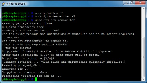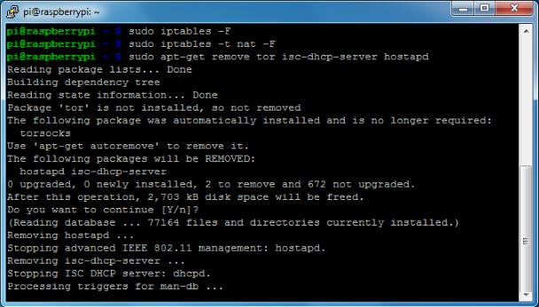 Als je in de vorige workshop geen Tor-router van je Raspberry Pi gemaakt hebt, ga dan verder naar stap 5. In het andere geval moeten we eerst nog enkele stappen van toen ongedaan maken. Eerst stellen we in dat de verbindingen op het wifi-netwerk rechtstreeks via de ethernetinterface gaan in plaats van via de Tor-software. We verwijderen de oude NAT-regels met sudo iptables -F en sudo iptables -t nat -F. En we verwijderen de Tor-software met sudo apt-get remove tor.