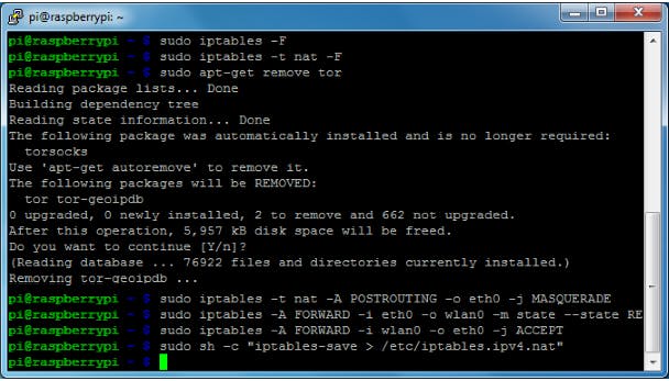 Daarna geven we met de volgende opdrachten de nieuwe NAT-regels in: sudo iptables -t nat -A POSTROUTING -o eth0 -j MASQUERADE, sudo iptables -A FORWARD -i eth0 -o wlan0 -m state --state RELATED,ESTABLISHED -j ACCEPT en sudo iptables -A FORWARD -i wlan0 -o eth0 -j ACCEPT. Sla de configuratie op met sudo sh -c "iptables-save > /etc/iptables.ipv4.nat". We hebben er in de vorige workshop al voor gezorgd dat die configuratie bij het booten van je Pi ingelezen wordt. Nu hebben we alle Tor-specifieke aspecten van de vorige workshop ongedaan gemaakt.