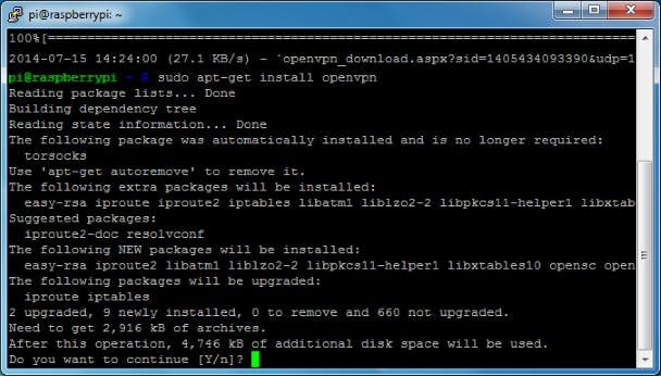 Nu maken we van onze Raspberry Pi een OpenVPN-client. Daarvoor heb je een account bij een VPN-provider nodig die het OpenVPN-protocol ondersteunt. Met wat geluk levert je provider ook een configuratiebestand voor OpenVPN. Rechtsklik op de url van het bestand in je browser en kopieer de link. Typ dan in je PuTTY-venster op de Raspberry Pi wget ", plak de url, voeg er " aan toe en druk op Enter. Krijg je geen configuratiebestand, kopieer dan een voorbeeldbestand met cp /usr/share/doc/openvpn/examples/sample-config-files/client.conf client.ovpn en lees hier wat je daarin verandert.