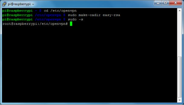 De OpenVPN-software hebben we in stap 6 al geïnstalleerd voor de VPN-router, en anders installeer je die met sudo apt-get install openvpn. Om OpenVPN als server te gebruiken, moeten we echter onze eigen certificaten aanmaken. Ga daarvoor naar de OpenVPN-configuratiedirectory met cd /etc/openvpn en voer sudo make-cadir easy-rsa uit. Omdat we nu voor de rest van de workshop allemaal opdrachten met sudo moeten uitvoeren, voeren we één keer sudo -s uit, zodat we de volgende keren geen sudo meer moeten opgeven. De opdrachtregel begint nu met root in plaats van met pi.