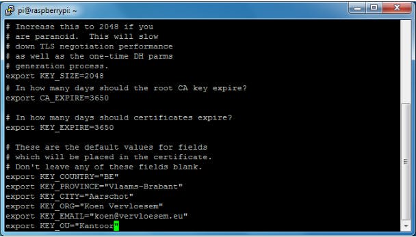 Ga nu naar de directory easy-rsa met cd easy-rsa en open het bestand vars met nano vars. We geven nu een aantal variabelen een waarde, zodat we bij het aanmaken van certificaten later niet telkens dezelfde waarden moeten ingeven. Wijzig de inhoud van de variabelen KEY_COUNTRY, KEY_PROVINCE, KEY_CITY, KEY_ORG, KEY_EMAIL en KEY. Voor het land vul je een tweeletterige landcode in (nl), voor de andere waarden is de inhoud vrij. Verander KEY_SIZE in 1024, want de standaardwaarde 2048 is te zwaar voor de Pi. Zie voor een voorbeeld de afbeelding. Sla op en sluit af met Ctrl+O en Ctrl+X.