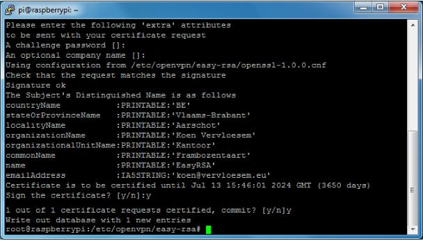 Daarna maken we een certificaat en sleutel aan voor onze OpenVPN-server. Dat kan met ./build-key-server Frambozentaart, waarbij Frambozentaart de naam van onze server is. Aanvaard weer de standaardwaardes, zeker voor Common Name, die gelijk moet zijn aan de naam van de server die je aan build-key-server doorgegeven hebt. De vraag voor een challenge password antwoord je met Enter, waardoor het leeg blijft en ook de optionele bedrijfsnaam laat je leeg. Op de vraag Sign the certificate? antwoord je bevestigend met y, evenals op de vraag erna.