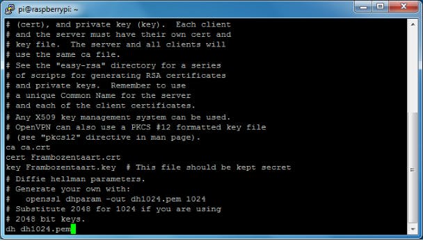 Kopieer nu de sleutels naar /etc/openvpn: cp keys/ca.crt keys/Frambozentaart.crt keys/Frambozentaart.key keys/dh1024.pem /etc/openvpn. Kopieer de voorbeeldconfiguratie: zcat /usr/share/doc/openvpn/examples/sample-config-files/server.conf.gz > /etc/openvpn/server.conf. Open het bestand met nano /etc/openvpn/server.conf en zoek naar de regels die achtereenvolgens beginnen met ca, cert, key en dh. Geef daarachter de juiste naam van de bestanden, zoals ca ca.crt, cert Frambozentaart.crt, key Frambozentaart.key en dh dh1024.pem.