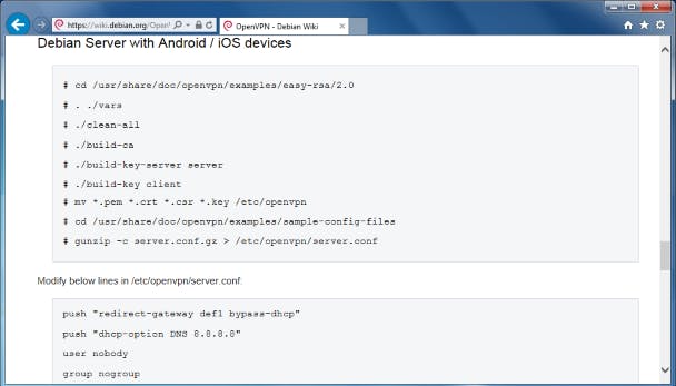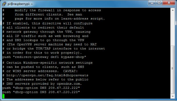 Zoek in het configuratiebestand naar de regel ;push "redirect-gateway def1 bypass-dhcp" en verwijder de puntkomma (;) vooraan de regel zodat deze actief wordt. Daardoor wordt je VPN-server de default gateway van de aangesloten clients, zodat ze via de VPN-verbinding kunnen surfen. Verwijder ook de ; vooraan de regel ;push "dhcp-option DNS 208.67.222.222" en de bijna identieke regel erna. Die twee regels zorgen dat de clients de DNS-servers van OpenDNS gebruiken. Sla tot slot het bestand op met Ctrl+O en sluit het af met Ctrl+X.